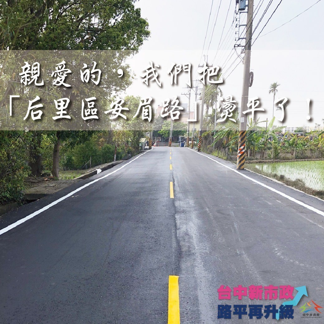 「親愛的,我們把道路燙平了!」市長盧秀燕上任以來積極推動路面「燙平專案」,引進俗稱「公路醫生」的熱再生修補車新型道路維修工法,可像熨斗般先整燙既有路面,搭配重複啟閉人手孔蓋技術,提升路面修補效率與品質,已完成165條道路改善,長度約51.9公里,面積約64萬6,452平方公尺,打造台中安全道路新環境。