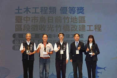 此外,「台中綠美圖新建工程」榮獲建築工程類優等、「大里區南門橋拓寬工程暨聯外道路拓寬工程」、「台中市立長億高級中學通學步道及人行道改善工程」、「和平區環山部落南湖溪新建吊橋」、「大安濱海樂園北汕溪虹橋改建工程」、「台中市烏日前竹地區區段徵收光竹橋改建工程」、「石岡區中91線道路復建工程」6件工程榮獲土木工程類優等、「中央公園(第一期)」榮獲設施維護管理類優等,陳局長及副總工程司黃一峰更榮獲個人貢獻獎,可謂此屆最大贏家。