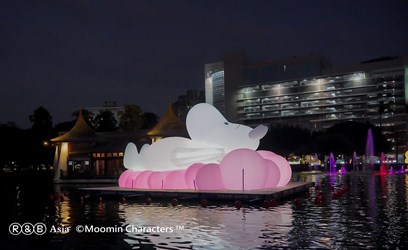 建設局說明,市府建設團隊以「幸福蜜馬 台中 MOOMIN ON!」為核心概念,將溫馨且正向的能量融入城市景觀規劃,此次特別安排童趣十足的「姆明(Moomin)」以躺平姿態現身台中公園日月湖,成為結合自然景觀與藝術裝置的全新亮點,不僅吸引攝影愛好者駐足取景,也期盼透過跨越國界的療癒形象,邀請民眾在漫步公園時,共同感受專屬台中的幸福時刻。