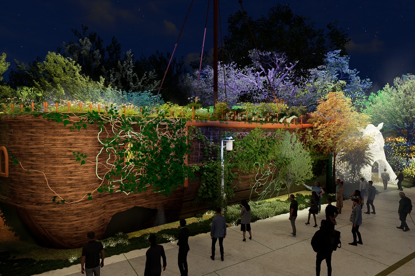 旅程首先將被氣勢磅礴的「馬首引領」震撼,踏入神秘的綠光之森,燈影在林間流動,彷彿瞬間穿越至遠古雨林;耳畔傳來鳥鳴、獸吼與風聲交織,春雷乍響,大地甦醒,萬物在黑夜中悄然復活。沉浸之際,偶然發現林深之處竟藏著一艘遺世獨立的擱淺船骸—「綠舟棲地」,引人無限想像。