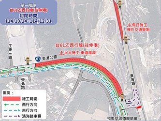 建設局指出,第一階段將封閉台61乙西行線(往伸港方向),並將東行線原雙車道調整為「雙向各一車道通行」;另濱海路近國道三號橋下,將於12月中下旬封閉部分南下路段,並改至北上路段採取雙向管制、彈性輪流通行。建設局提醒用路人可參考建議改道路線(詳見改道替代路線圖),提前規劃行程,避開易壅塞區域,並遵守現場管制引導,減速慢行,注意行車安全。