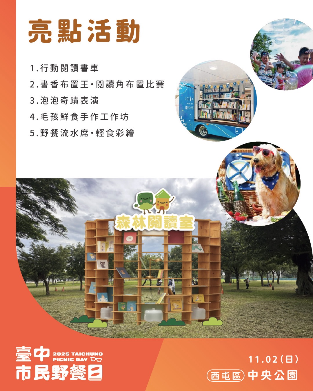 「2025第四屆台中市民野餐日」將於11月2日(星期日)盛大登場!今年以「草地閱讀」為主題,於全市29區同步舉行,主場設於西屯區中央公園,結合「台中綠美圖」開幕,打造書香與綠意交織的城市野餐盛會。市民可至綠美圖借書後,漫步中央公園草地閱讀,享受悠閒午後時光。現場設有三大主題區,並首度導入市集活動,台中市政府建設局邀請市民攜家帶眷,共度溫馨假期。
