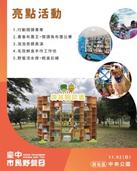 建設局補充,現場並設有舊書交換攤位,持續推動閱讀融入生活,讓書香隨行不間斷。中央公園不僅是市民野餐首選場域,更是「台中美樂地」計畫的重要據點,公園3.0升級設計融合遮陽與降溫功能,提供全年無休、友善舒適的遊憩環境。