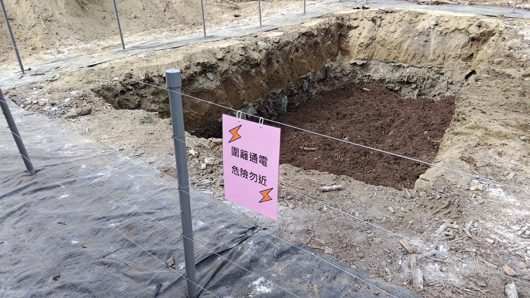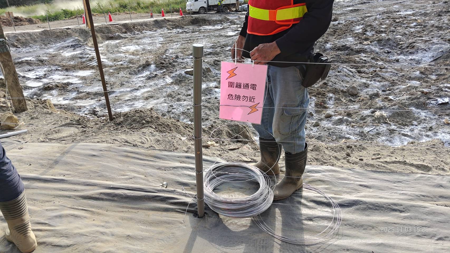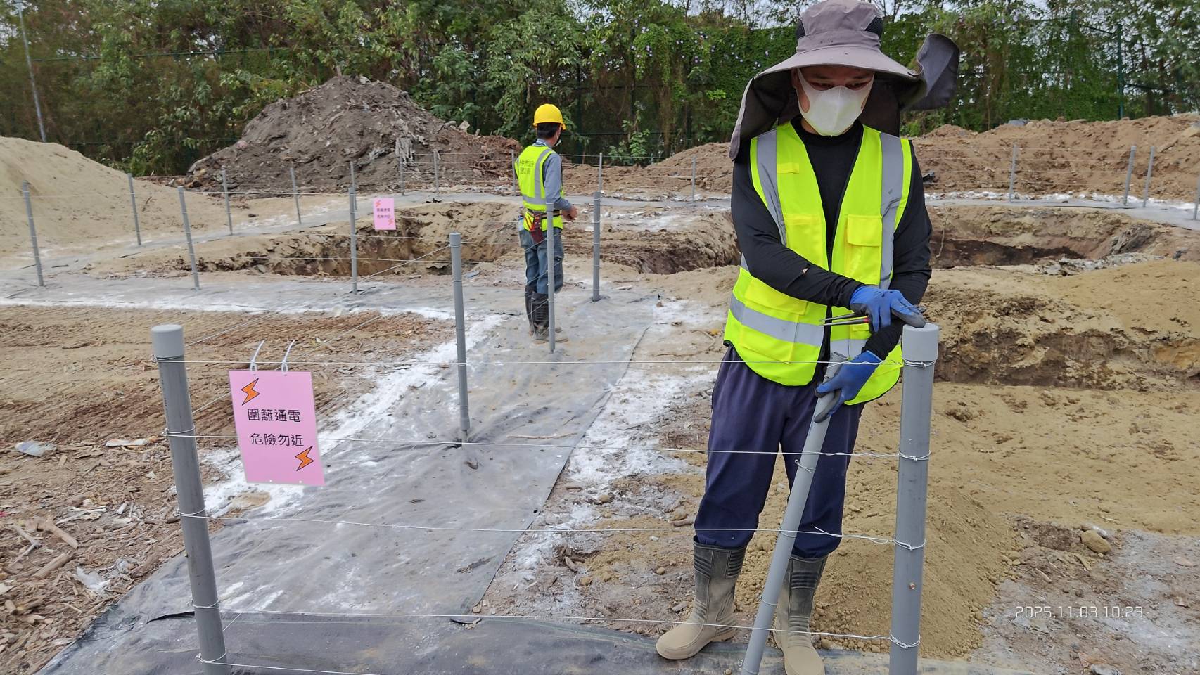 建設局說明,此次作業採兩階段進行,第一階段先鋪設抑草席及立柱,第二階段再加裝電網並完成電壓測試。