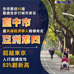建設局表示,「台中市道路人本環境政策發展論壇」已舉辦至第二屆,今年更邀請澳洲雪梨科技大學教授Rhys Williams跨海分享國際步行城市經驗,並首度辦理學生競圖,吸引13所大專院校、共120件作品展現創意。市府也與交通局、警察局、教育局跨局處合作,從設計、硬體、宣導到執法多面向著手,讓台中市在2025年英國《經濟學人》研究中獲評為全球步行友好城市第49名、亞洲第4名,並在中央「金路獎」與道路考評中屢獲佳績,展現市府推動人本交通的卓越成果。