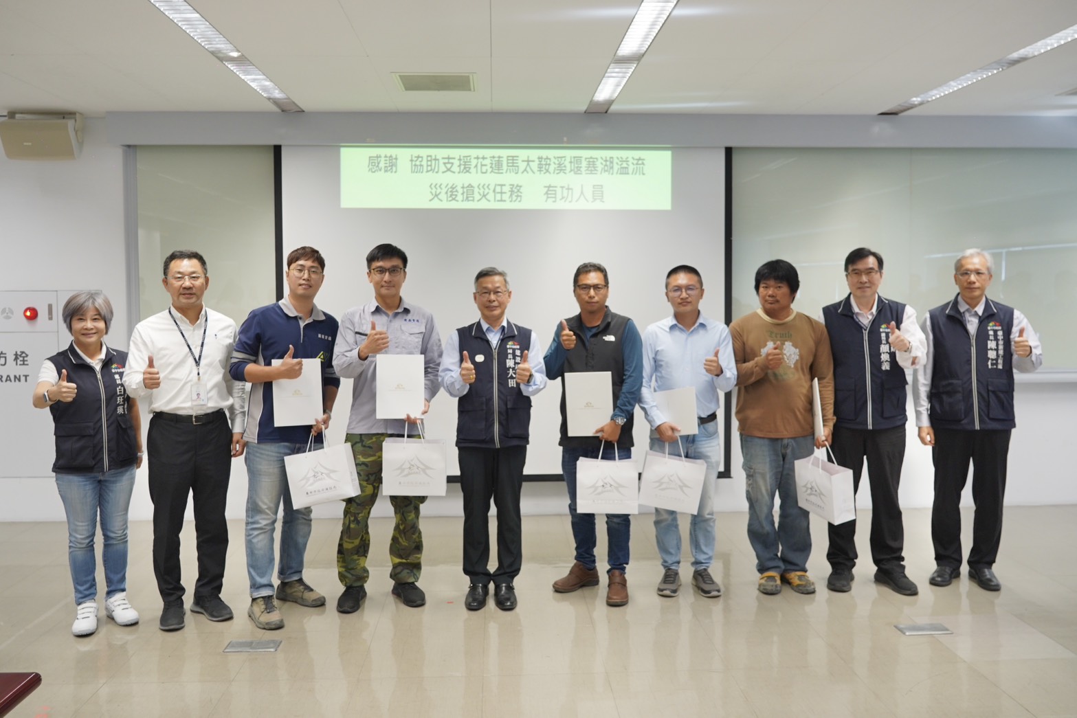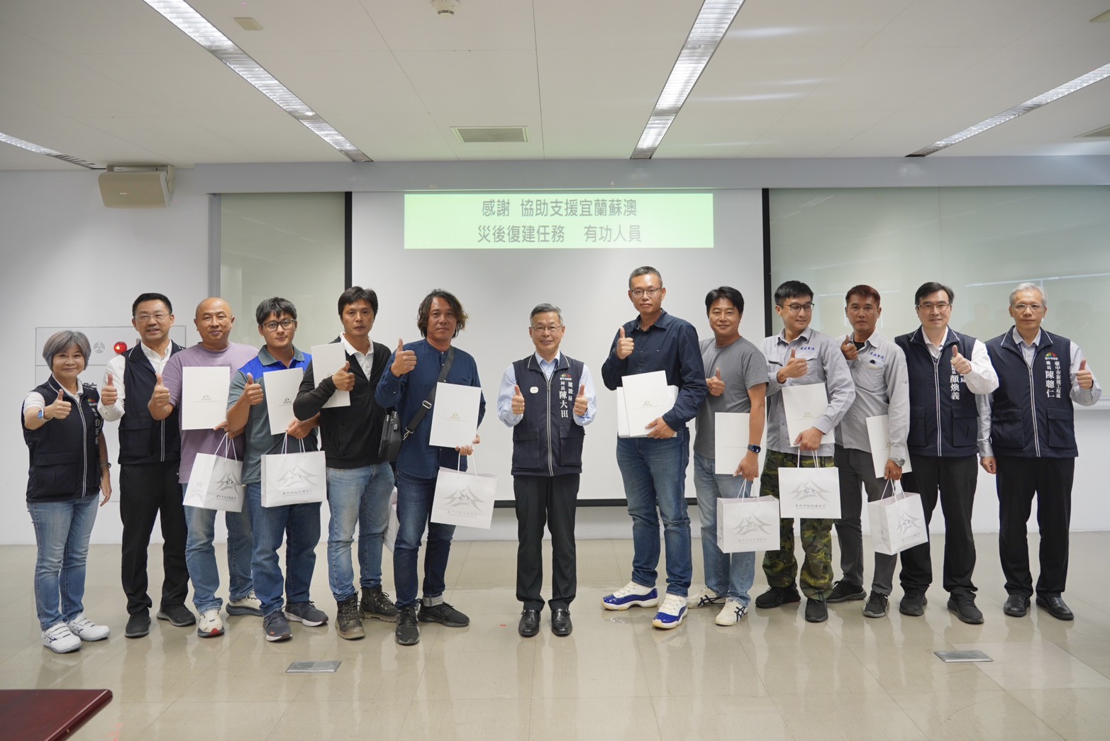 陳局長表示,花蓮光復鄉於114年9月23日受樺加沙颱風重創,豪雨引發馬太鞍溪堰塞湖壩頂溢流,造成嚴重災情;隨後在11月12日,宜蘭蘇澳又因鳳凰颱風外圍環流降下特大豪雨,多處地區嚴重淹水,災況同樣嚴峻。盧市長獲報後立即指示成立「救災台中隊」,並協調麗耀營造、建鑫營造、豪大土木包工業、宏茂園藝社、濬廣企業、高比麗營造、金瑞營造、揚林園藝景觀工程、真將園藝、森弘環保科技、寶徠興企業、千藝園園藝事業等廠商,全力投入兩地災後復原,實踐「同島一命、守望相助」的價值。