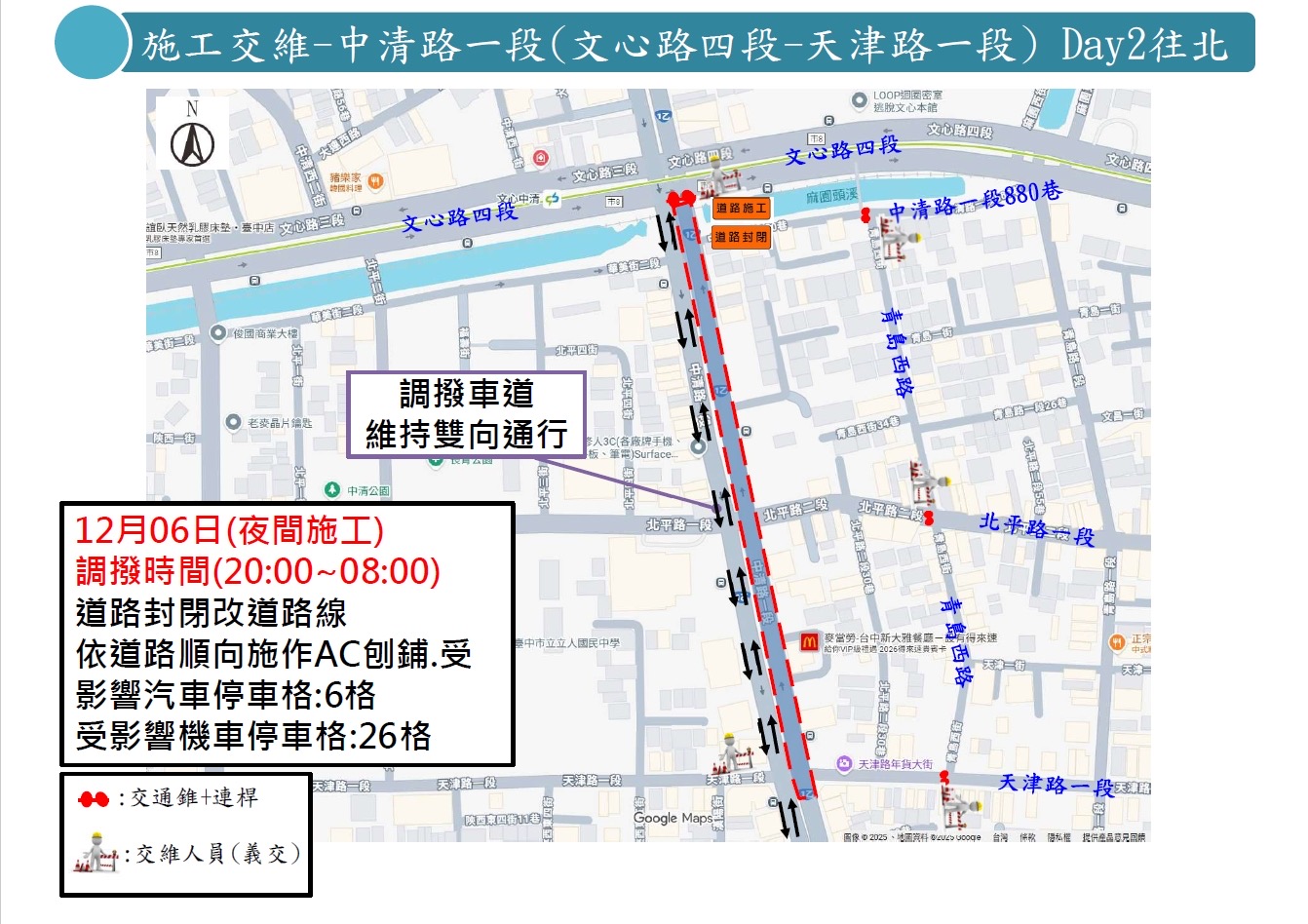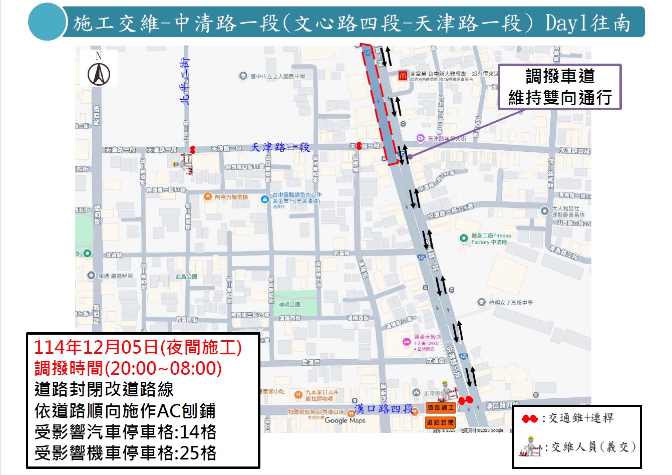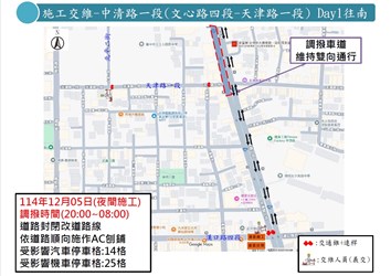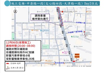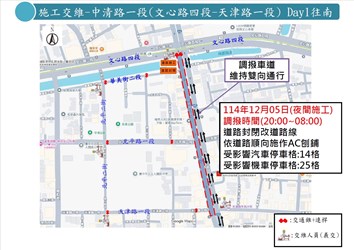 建設局長陳大田表示,市府持續推動各項人本改善工程,市長盧秀燕也特別重視行人安全與道路品質。為減少對白天交通的影響,這次工程採取夜間施工,並分段進行以確保道路通行。12月5日將施作天津路至文心路西側,12月6日再施工東側,主要作業包括路面刨除與重鋪。施工期間會依中央分隔島分段調撥車道並部分封閉,白天恢復通行;若單側提前完成,也會立即開放,並安排專人引導交通,靈活調整封閉範圍,兼顧行車順暢與施工品質。