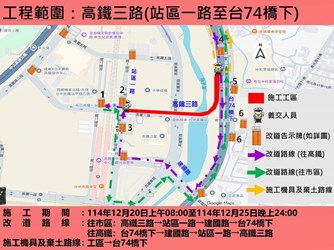 陳局長指出,為凝聚地方共識,市府已於12月10日邀集烏日及南屯區立法委員、市議員、里長及高鐵公司等相關單位召開說明會,獲得各界支持。工程預計於12月20日8時進場施工,並於12月25日24時前完工,施工內容將依序進行分隔島打除、路面刨封及標線繪設。