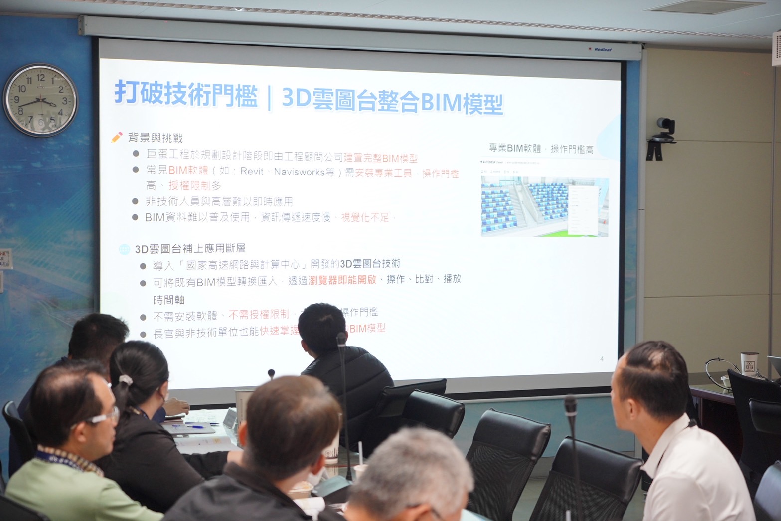 陳局長表示,此次與國研院國網中心合作,結合地理資訊系統(GIS)與建築資訊模型(BIM),並導入數位孿生、人工智慧及AI影像辨識等新技術,成功建置三維GIS資訊系統,以三維視角即時呈現場館結構、施工進度及智慧安防資訊,讓工程執行進程與建築模型成果一目了然。台中巨蛋工程規模龐大、工項複雜,是新技術驗證的最佳示範場域,不僅可驗證智慧科技於實務上的可行性,也能透過數位模擬方式「看見未來巨蛋」,協助建設團隊精準掌握工程進度、控管安全風險,進而提升整體工程管理效益與決策效率。