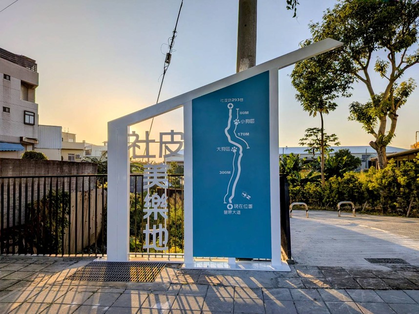 建設局說明,此次入口設計結合寵物園區概念,以白色及藍綠色鐵件呈現清新風格,並增設黑色欄杆提升質感,同時改善入口鋪面、栽植羅漢松,使整體環境更開闊舒適;入口前的「社皮美樂地」公車亭也方便民眾攜帶毛孩搭乘大眾運輸前往公園。透過此次優化,公園辨識度與使用動線全面提升,市民與毛孩休憩更便利、友善,也讓迎賓景觀更具特色與親切感。