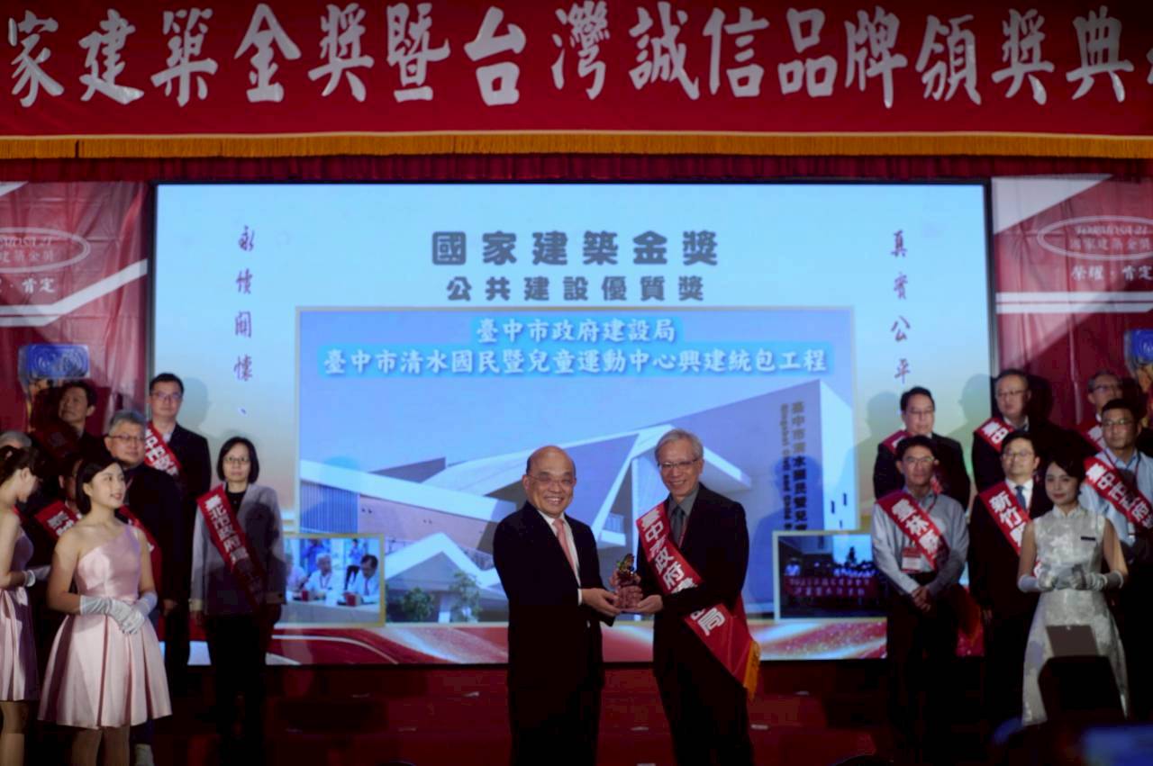 第26屆國家建築金獎頒獎典禮昨(30)日午間盛大舉行,台中市政府建設局以「台中市清水國民暨兒童運動中心興建工程」及「臺中市北屯國民暨兒童運動中心興建工程」兩項重大公共建設同步獲獎,雙雙榮獲「施工品質類公共建設優質獎」,其中清水國民暨兒童運動中心更在眾多優秀工程中脫穎而出,勇奪最高榮譽「全國首獎」;此外,建設局長陳大田更再度獲頒大會特別獎,展現台中市公共工程品質連年精進、屢獲肯定,為城市建設再創巔峰。