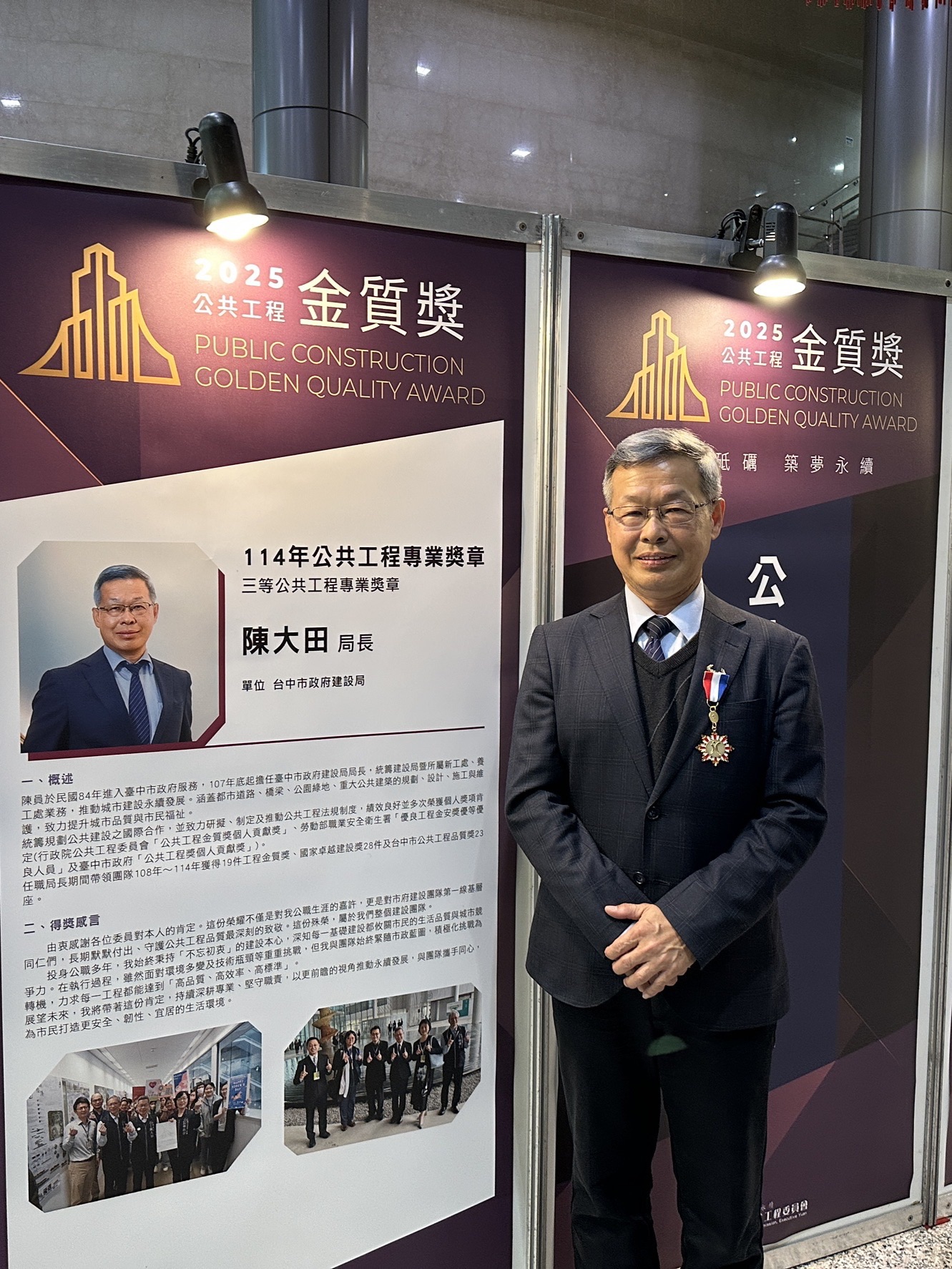 行政院公共工程委員會昨(21)日舉行第25屆公共工程金質獎頒獎典禮,台中市政府建設局以「東勢區埤豐橋改建工程」榮獲土木工程類優等殊榮;同時,建設局長陳大田因長期推動優質公共工程、成效卓著,獲頒全國唯二的「公共工程專業獎章」,為台中市公共建設再添榮耀。