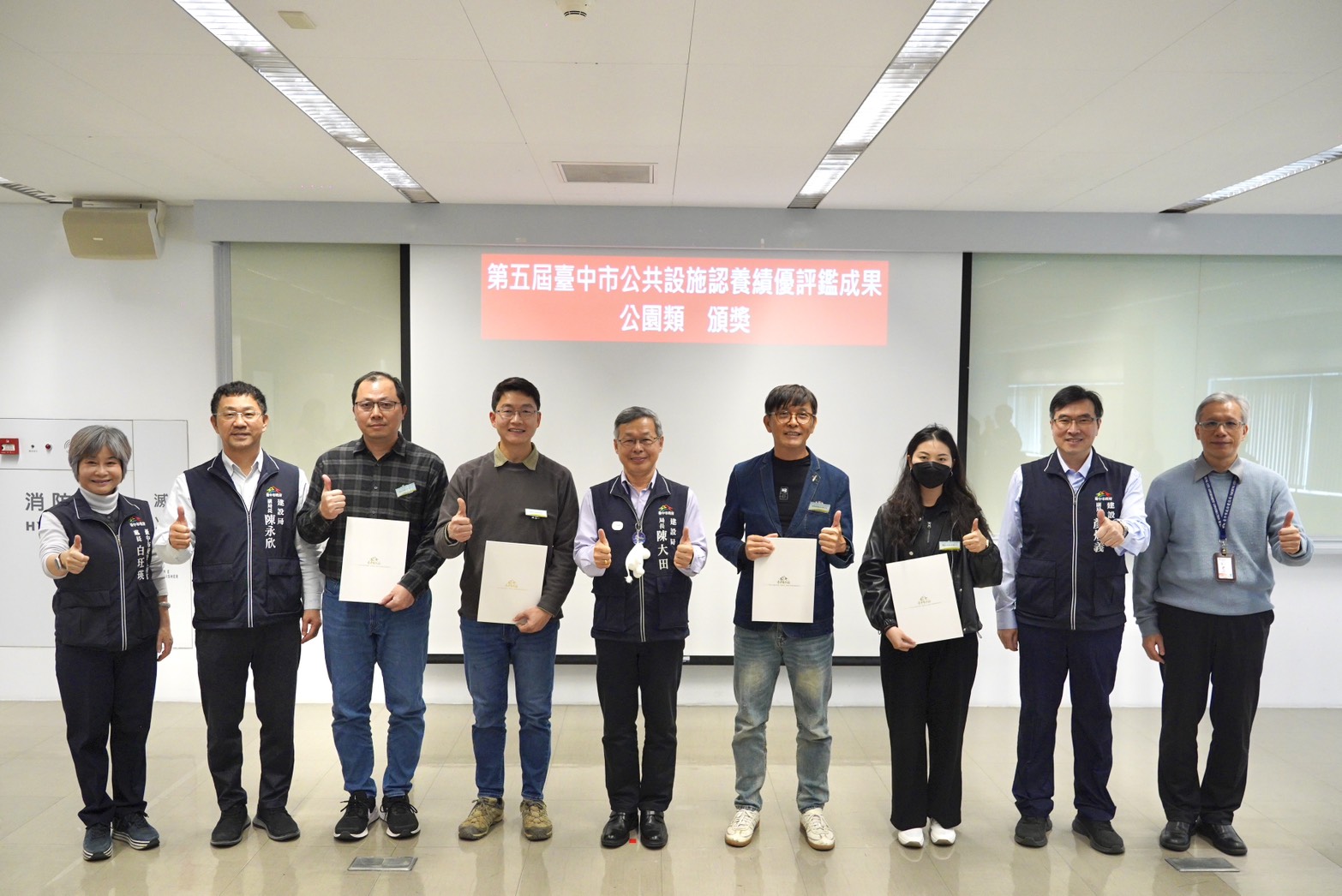 陳局長說明,今年參與評鑑案件多達321件,競爭相當激烈,此次獲獎的18家單位能自眾多案件中脫穎而出,展現高度的企業社會責任與專業精神;其中不僅有惠昇建設、寶輝建設、雙橡園開發、和築建設、登陽建設、山林復育協會、寶成工業等知名企業團體長期投入、持續獲肯定,也有沅林建設、育堂建設、富宇地產等企業首次參與評鑑,即獲得優異成績。陳局長指出,獲獎名單兼具「傳承」與「新血」,象徵台中公私協力的綠色能量持續擴散,並逐步深植企業經營理念。