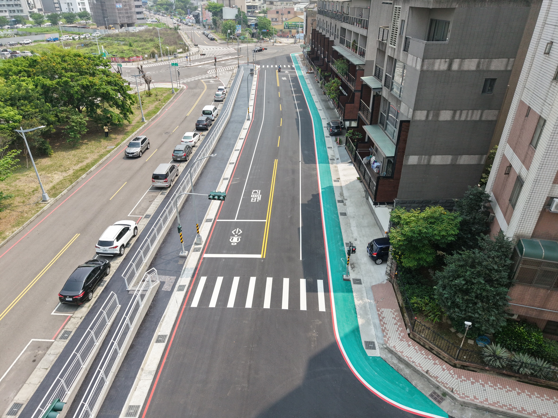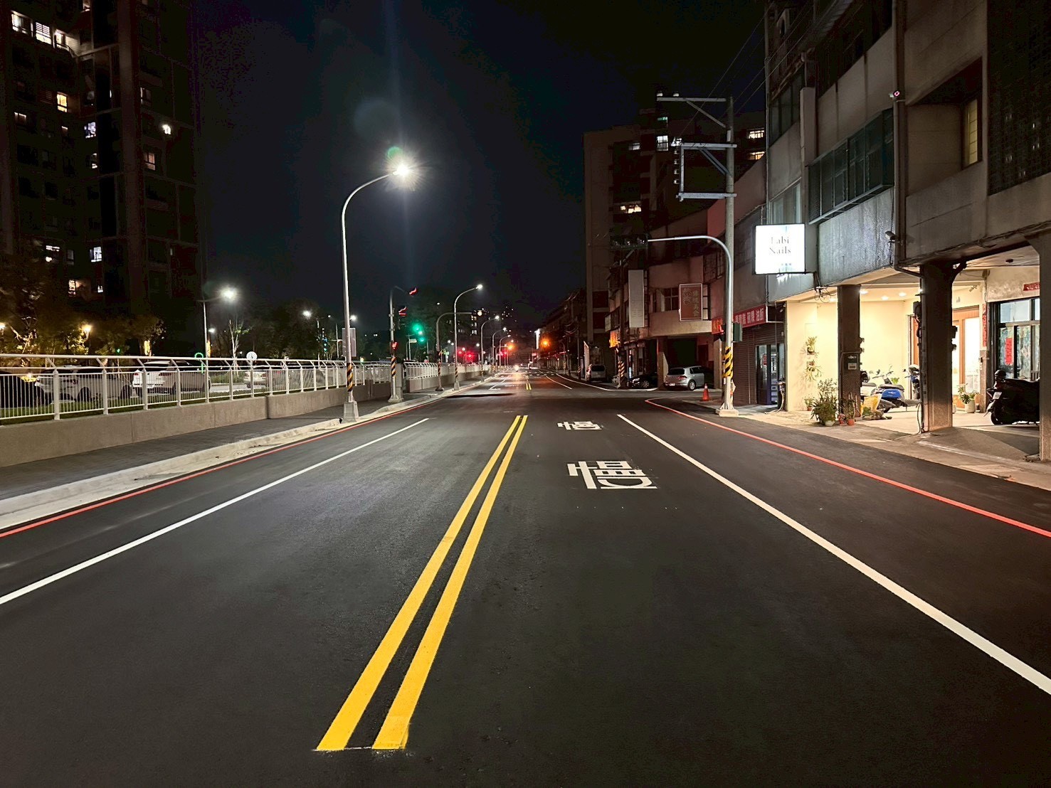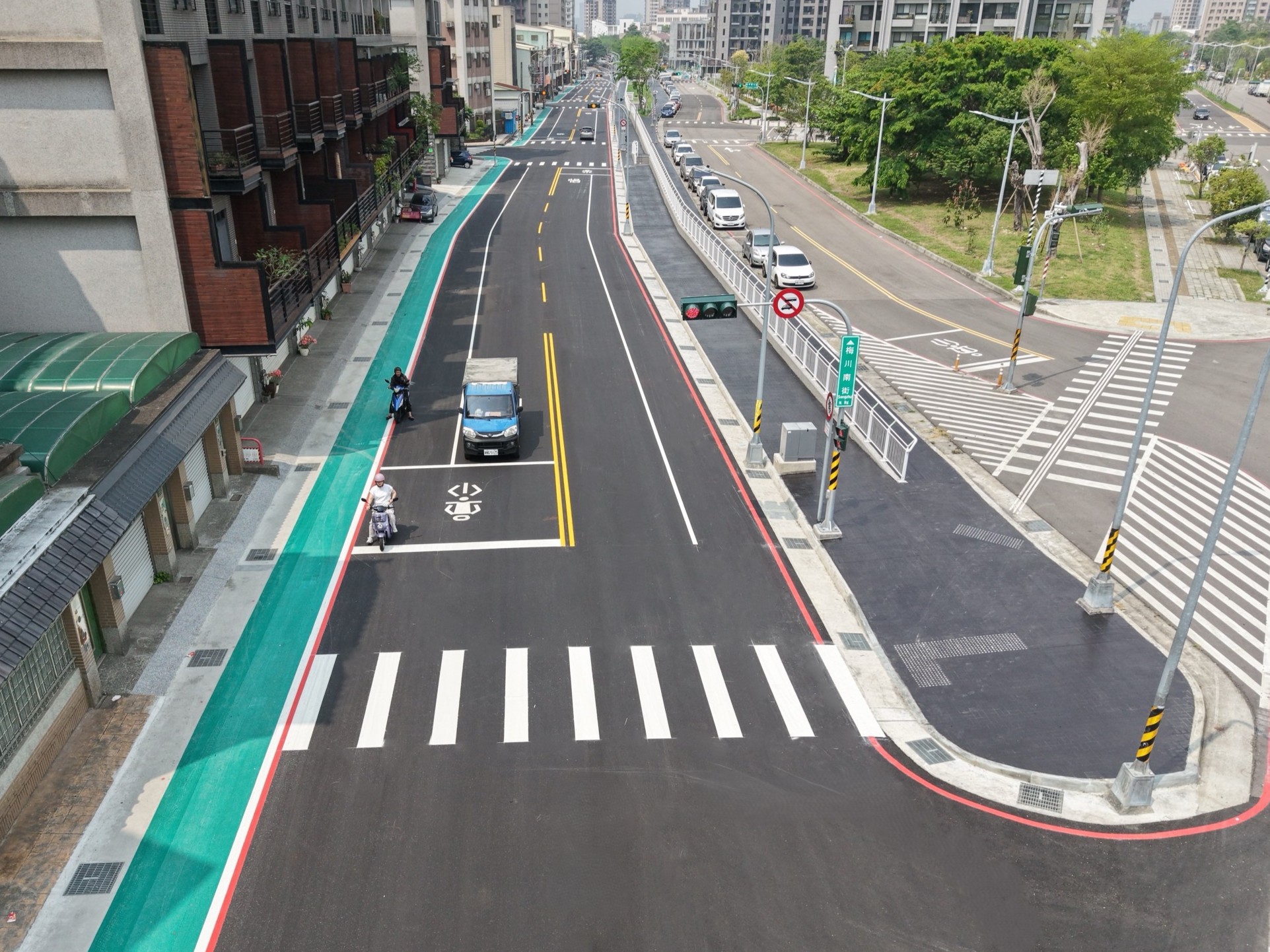 建設局補充,工程總經費3億600萬元,其中用地費約2億5,500萬元、工程費約5,100萬元,施工內容包含填平廢棄河道、設置交通號誌、路燈、側溝及人行道等設施,工程自113年12月10日開工,已如期於今日完工通車。完工後不僅有效紓解交通壅塞,也串聯新舊市區路網,進一步強化地方發展動能,落實「富市台中 行人安全」施政目標。