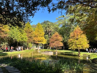 陳局長進一步說明,位於太平區的「太平苗圃落羽松林」更是隱藏版賞景秘境,園區內栽植上百株落羽松,林木排列整齊、倒映水面,隨季節光影變化呈現不同層次的色彩,景致如畫。每到入冬時節,樹梢自綠轉金,再漸染橘紅,搭配藍天白雲,宛如置身歐風童話森林,吸引不少攝影愛好者專程前往取景。