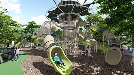 建設局表示,鰲峰山「谷溜遊戲場」基地面積約3,500平方公尺,總經費約7,625萬元,以「全國最多溜滑梯遊戲場」為設計目標,規劃多層次遊戲動線,結合大型遊戲塔、滾輪滑梯、攀爬設施、沙坑區及高架步道等多元設施,並導入通用設計理念,打造全齡共融的親子遊憩空間,目前工程進度穩定,預計於115年3月完工。
