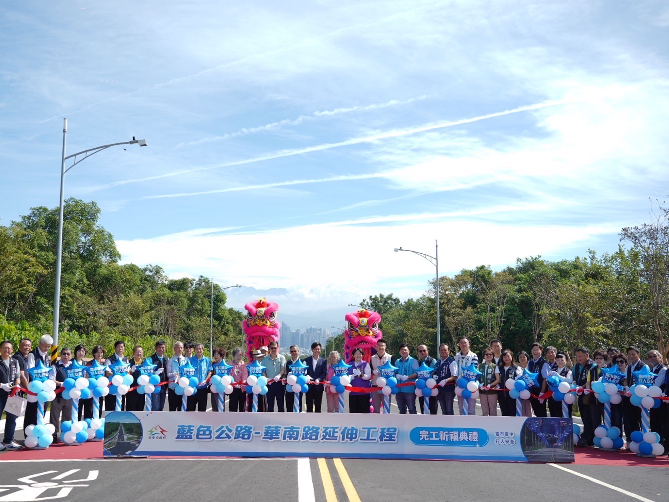 地方期盼近20年的大肚區「藍色公路」華南路延伸工程,歷經台中市府團隊努力,於114年10月31日正式通車!由台中市政府副秘書長林育鴻代表市長盧秀燕主持完工通車典禮,全長1,864公尺、寬20公尺的華南路自遊園路延伸至向上路,如同將藍色項鍊延長,串起大肚山脈,形成絕世美景;工程總經費斥資13.26億元打通大肚山交通瓶頸,不僅紓解遊園路及中台路口長期壅塞,也兼顧行人安全與生態永續,成為居民期盼已久的重要建設。