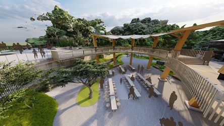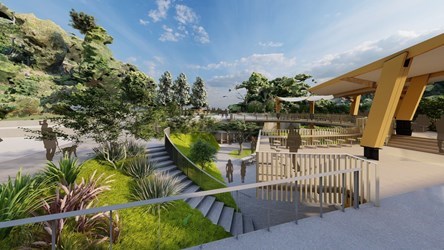 建設局指出,觀音亭休憩平台位於登山步道的中繼站,整體設計以低彩度色調融入自然環境,並因應未來人流增加及夏季日曬,特別擴大平台面積並增設遮陽設施,遮蔽範圍達234平方公尺,且具可收折功能,提升使用彈性與整體舒適度。