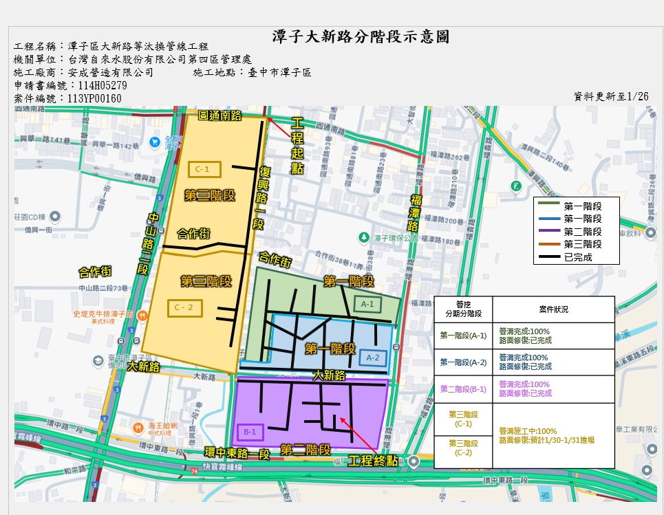 建設局說明,此次施工範圍涵蓋潭子區復興路一段及周邊巷道,目前剩餘施工長度約655公尺,預計於1月30日及31日進場施作,工程採「汰管完成即進行路修」的方式銜接執行,有效縮短施工期程,降低對居民通行與生活作息的影響。